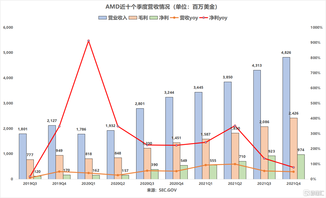 整体来看,AMD这份财报就是三个字“超预期”:21Q4营收同比增48.8%至48.26亿美元(预期45亿美元),连续第六个季度营收同比增速保持在45%以上;调整后EPS为0.8美元(预期0.75美元);净利润9.74亿美元,同比下降45%(若剔除所得税准备金影响,则同比增20.2%,上季同比增速为21.4%);调整后运营利润率27%(预期24%)。21年全年同比增68%至164.34亿美元,净利同比增27%至31.62亿美元,调整后EPS为2.57美元。