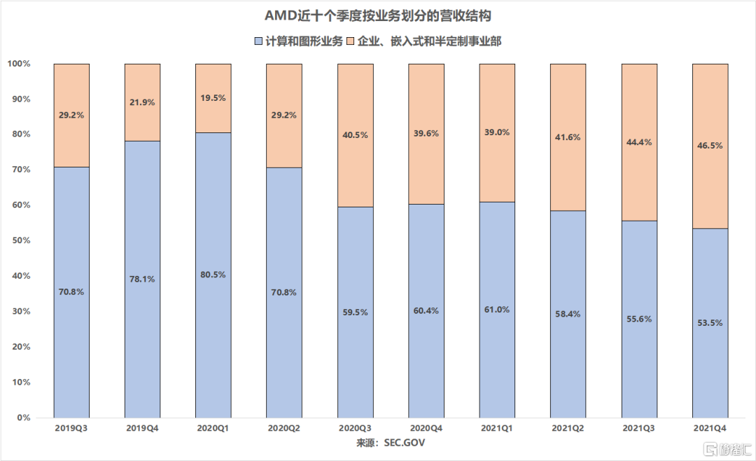 另外,由于云和企业客户越来越多地采用AMD EPYC处理器及数据中心解决方案,AMD还越来越受益于企业端:亚马逊AWS、谷歌云、IBM云、微软Azure等云计算巨头宣布了多个新的AMD驱动实力。21Q4企业端营收同比增75%至22.42亿美元,(20Q3-21Q3同比增速分别为116%、176%、287%、183%和69%),21年全年企业端营收同比增113.2%至71.02亿美元,同时营收占比从20Q1的19.5%增至21Q4的47%。