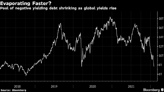 包括日本在内的全球基准国债收益率的上升正在减少全球负收益率债券的数量,令美国国债市场失去又一支撑。指数显示,负收益率债券规模已降至7.67万亿美元,为2018年以来的最低水平,远不如2020年末创下的18.38万亿美元的峰值。