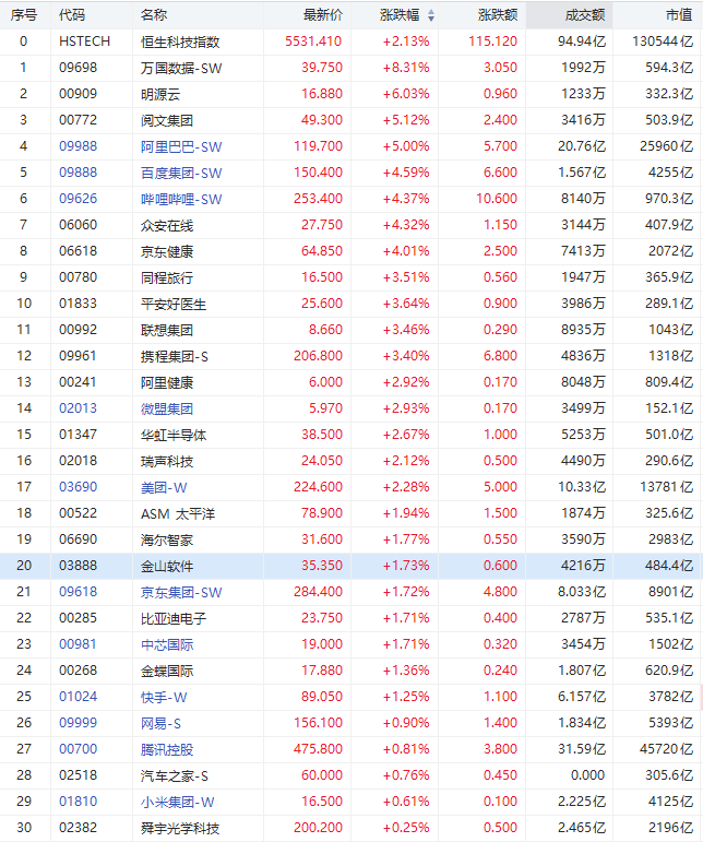 盘面上,Saas概念股走强,万国数据涨8.31%领涨成分股,现报39.75港元每股;明源云涨6.03%;金蝶国际、金山软件跟涨。科网股普涨,阿里巴巴涨5%,报119.7港元每股;百度、B站涨超4%;美团涨2.28%;京东涨1.72%;快手、腾讯、小米跟涨。