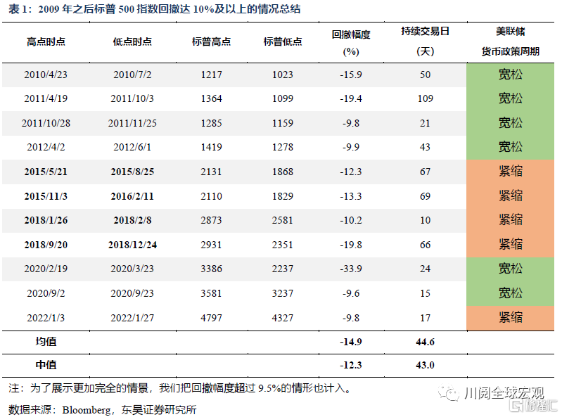 美联储:回撤超过10%,降低紧缩预期;回撤超过20%,停止紧缩。以史为鉴,我们回顾了2009年以来美股回撤达10%以及以上的情景,其中处于美联储货币政策紧缩阶段的有4次(不包含2022年1月)。主要集中在两个阶段:2015年下半年至2016年初美联储首次加息前后;2018年、上一轮美联储紧缩周期末期(表1)。当时美联储采取了什么行动?市场又是如何演绎的?