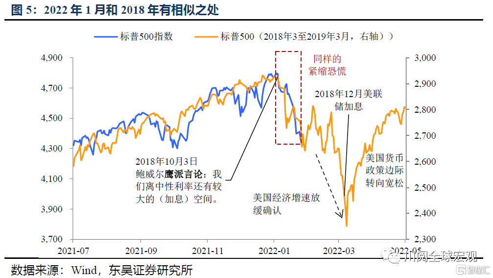2018年12月:市场比较喜欢将2022年1月与2018年10月类比,从股市行情确实有类似之处,2018年10月3日鲍威尔接受采访中表示“离中性利率还要较大的(加息)空间”开启了美股暴跌的行情,12月最后一次加息后,2019年货币政策重回宽松,股市也随之反弹(图5)。