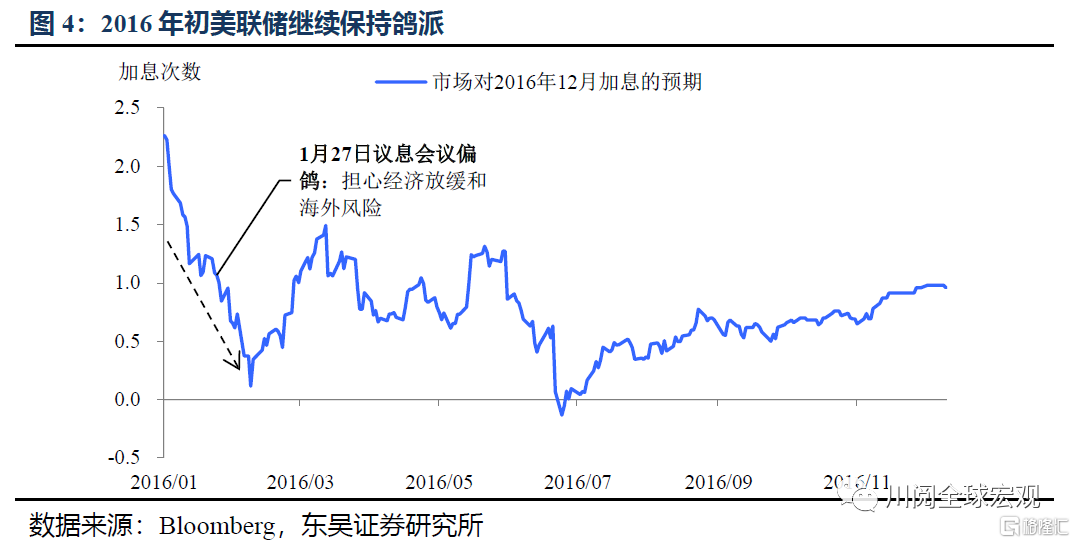 2015年至2016年:2014年10月美联储Taper结束,市场静待加息落地,2015年初市场的基本预期是6月和12月美联储分别加息1次。不过由于新兴市场动荡(比如中国经济下行,人民币汇率改革等)、原油价格暴跌,美国股市也震荡下跌,美联储的反应是持续降低加息预期,股市在9月企稳、10月反弹。直到11月初公布的10月会议纪要才透露2015年年内加息较为确定的信号(图3)。2015年12月首次加息后股市继续暴跌(背后也有人民币汇率贬值和中国股市“熔断”的影响),2016年1月美联储再放“鸽”,一度导致市场预期年内不加息,也帮助美股在2月完成企稳反弹(图4)。