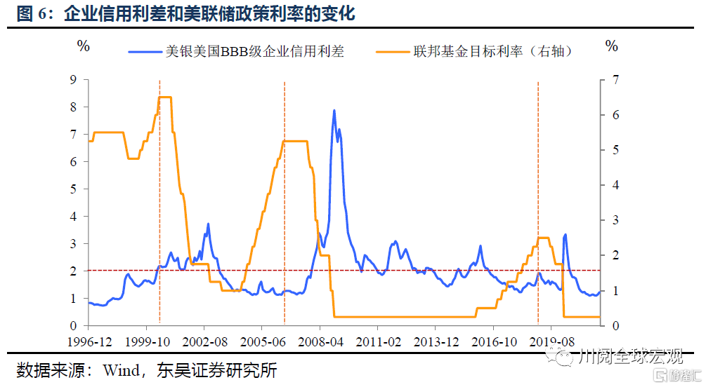 除了股市之外,信用利差也是影响美联储的重要市场指标。股市之外,信用债市场也是美国直接融资的重要组成部分,信用利差是测量该市场健康与否的重要指标,当BBB级(属于投资级中的最低级)信用利差超过200bp时,美联储也会果断出手呵护市场(图6)。