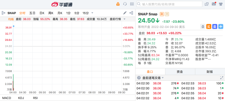 华盛资讯2月4日消息,美股盘前,Snap(SNAP)一度大涨55%,现涨幅缩窄至52%,周四盘后Snap发布财报称,公司录得历史上首次季度净利润;亚马逊(AMZN)盘前涨超12%。