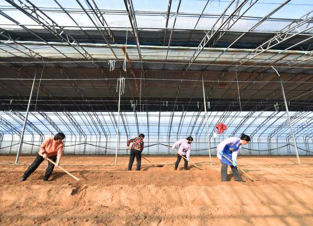 2月4日,在山东省聊城市茌平区贾寨镇耿店村蔬菜大棚,村民在忙着起垄,为种植甜瓜做准备。