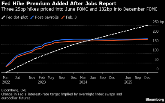 2年期国债收益率上涨12个基点,触及1.315%的日内高位,因为短端开始重新定价加息路径。3月隔夜指数掉期(OIS)合约一度显示,对加息50个基点概率的预期达到接近50%,对第六次加息时间的预测开始变成12月。
