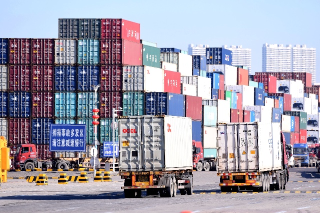 2021年12月7日,在山东港口青岛港,运输集装箱车辆从堆积的集装箱旁经过。新华社图。
