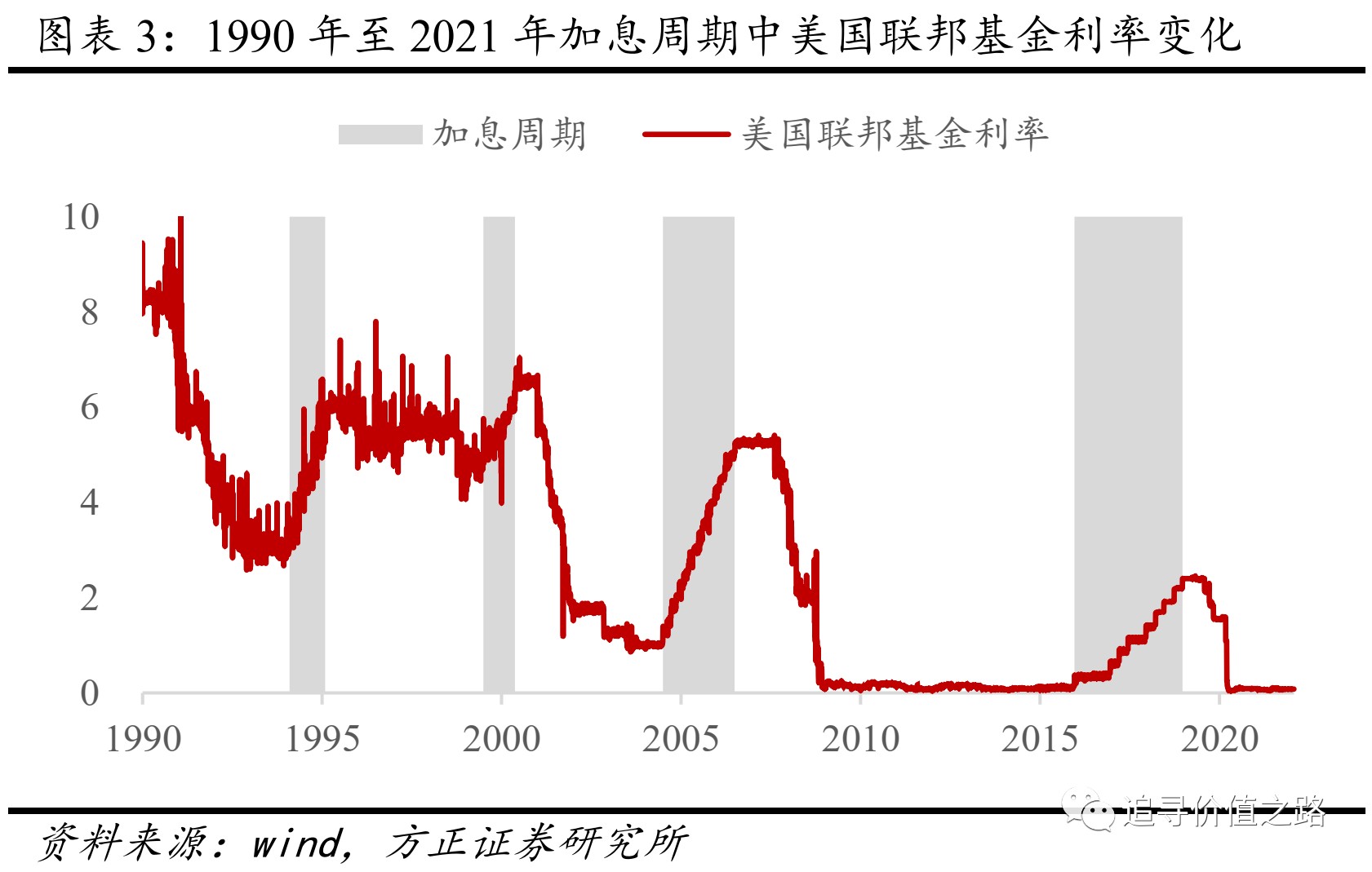 这13次加息周期的平均加息周期时长约25个月(定义为从首次加息起算,一直到末次加息时间为止),平均每个加息周期的累计加息幅度约287个BP。如果仅考虑1990年以后,美联储明确使用联邦基金利率作为货币政策中介目标,那么后4次加息周期的平均时长约为21个月,平均每次的累计加息幅度约281个BP,也基本差不多。