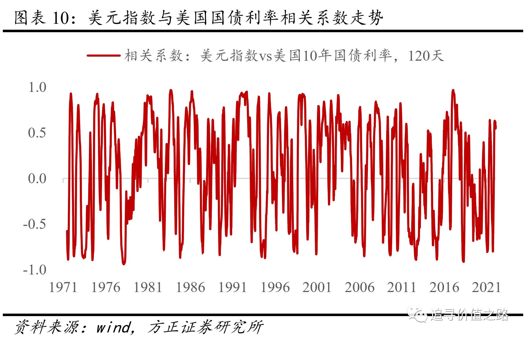 再进一步,如果我们把美国国债利率和美元指数的相关系数画出来(参见图表10),就会发现,这两个指标间的相关系数是不断变化的,有时候两者高度正相关(相关系数接近1),有时候两者又会高度负相关(相关系数接近-1)。从1971年美元脱离与黄金的固定汇率后至今,美元汇率既可以在美国加息周期中贬值,也完全可以在降息周期中升值(参见图表9)。