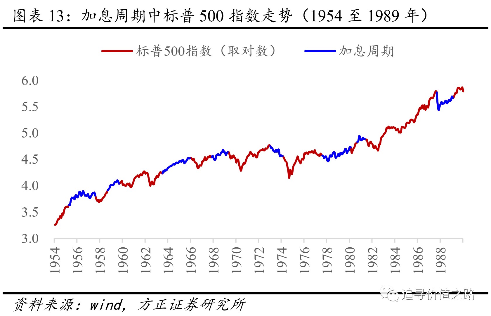 从图表13和图表14中可以发现,除了极个别情况外(1973年和1987年),标普500指数在加息周期中多数情况下都是上涨的。毫无疑问,这背后反映了一个重要的基本面逻辑,即多数情况下,美联储之所以加息是因为经济好(甚至过热),企业盈利的增长幅度超过了估值回落的幅度。