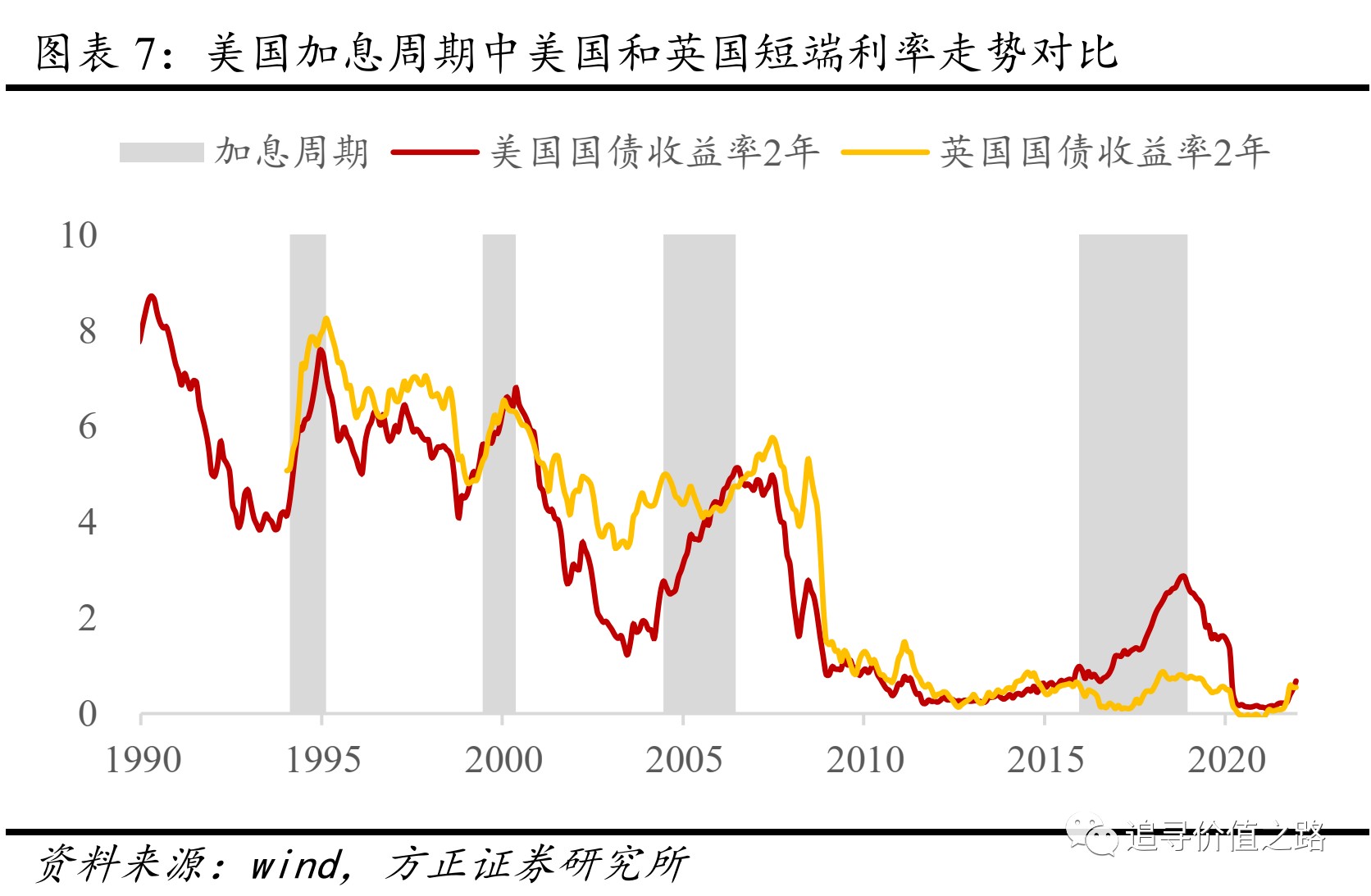 (1)美联储加息并不必然带动发达国家进入加息周期,从而推升全球利率水平。英国、韩国等国家一般会跟随美联储加息步伐,而日本、德国等国家在2000年以后并不完全跟随美联储的加息周期,发达国家之间货币周期错位也经常发生。
