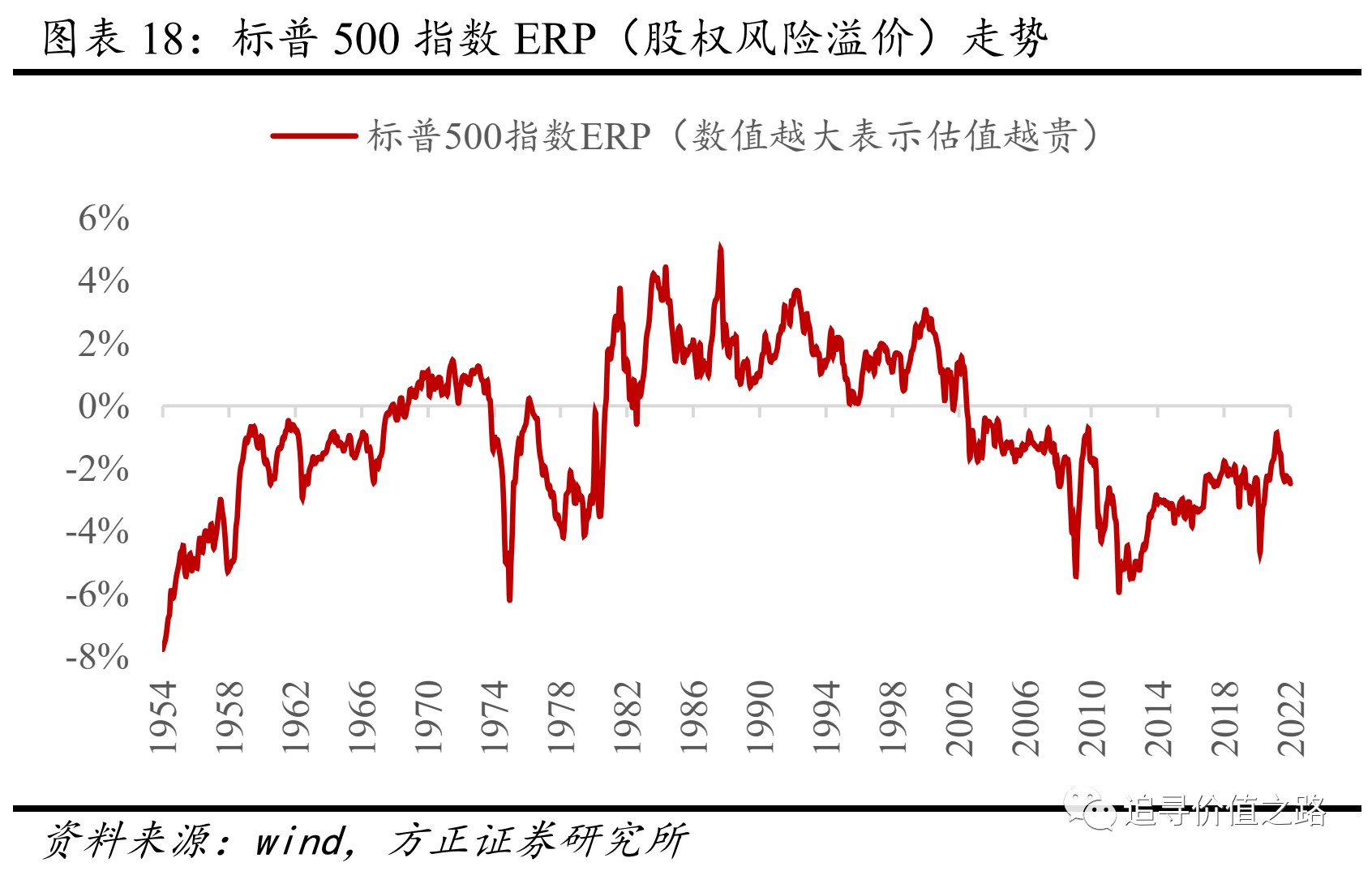 (5)按目前市场预期,今年加息四次联邦基金利率可能达到1.0%左右,后续高点可能在2.1%到2.5%,参照以往历史经验,美国十年期国债利率高点预计也在2.5%左右。依此利率考量目前美股的ERP估值,则仍处在50年代以来的均值水平以下,出现系统性风险可能性小。