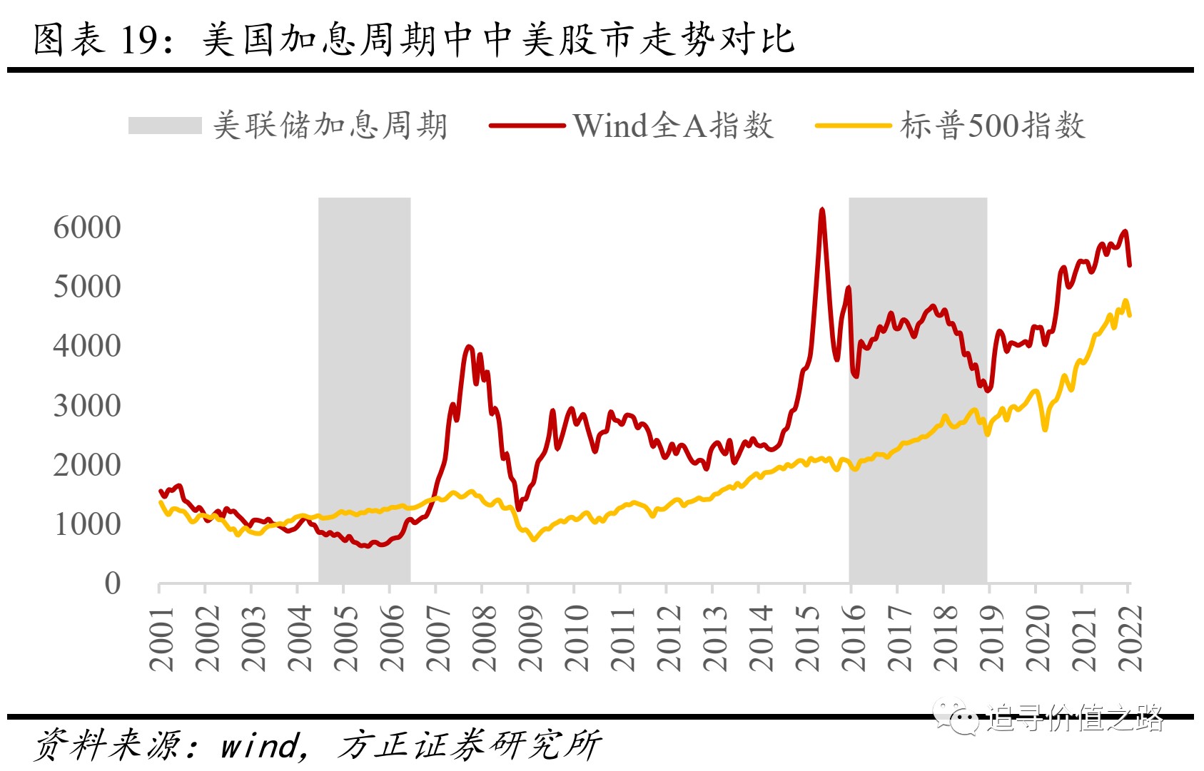 (3)从美联储加息周期对国内流动性影响来看,前文已经详细分析过,两者并没有必然的联系。美联储加息过程中,国内继续保持流动性宽松以及利率下行,非常正常。一个较为普遍的担心是,如果美联储持续加息,而同时国内保持流动性宽松甚至降息,国内外利率差将导致人民币汇率有较大贬值压力。我们认为这个有点过虑了,美联储加息从来都不是美元升值的充分条件,而利率差只是影响汇率的一部分原因(甚至是很小的一部分原因),如果美国通胀无法遏制而导致持续加息,相反人民币汇率更有可能升值,这个在前文中也仔细讨论过。