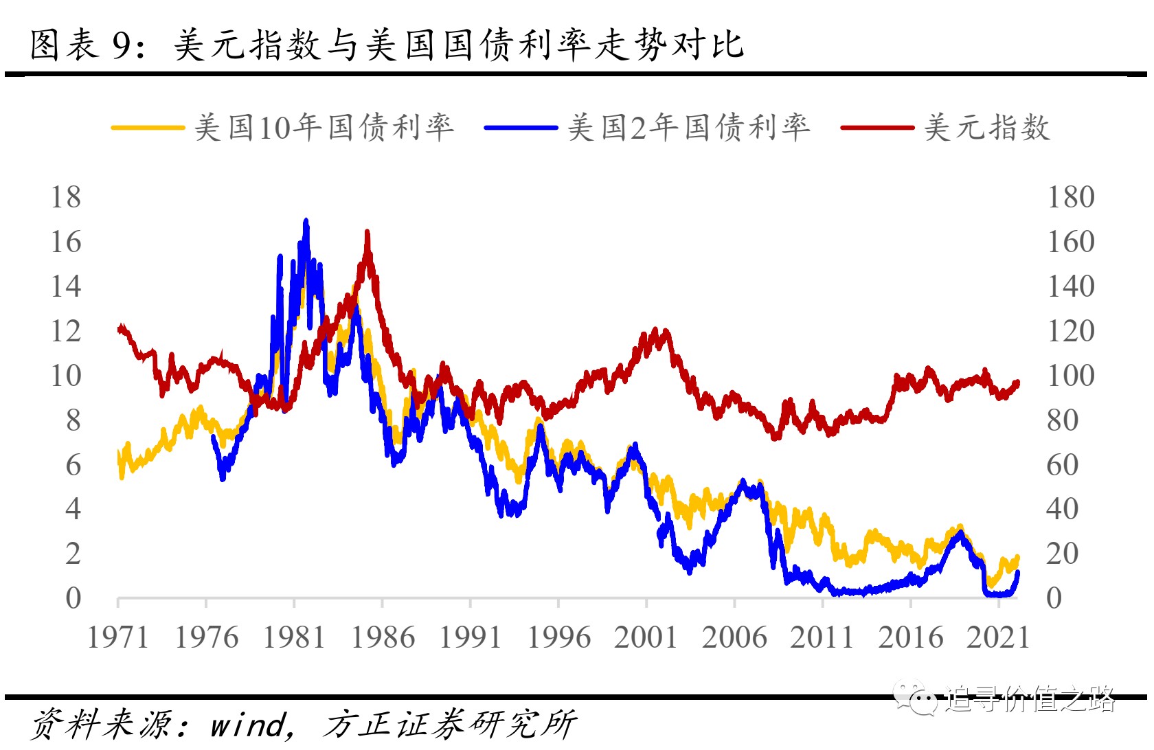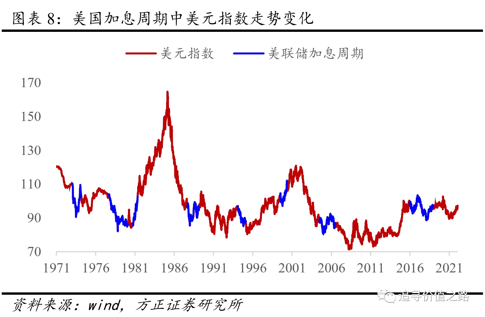 美联储加息=>美元升值=>其他国家资本外流,这个逻辑推演中,美元大幅升值确实容易引发国际资本大幅流动,但是,美联储加息并不必然引起美元升值。从1971年以来美元指数的走势情况来看,美联储加息和美元升值两者是没有必然联系的(参见图表8)。