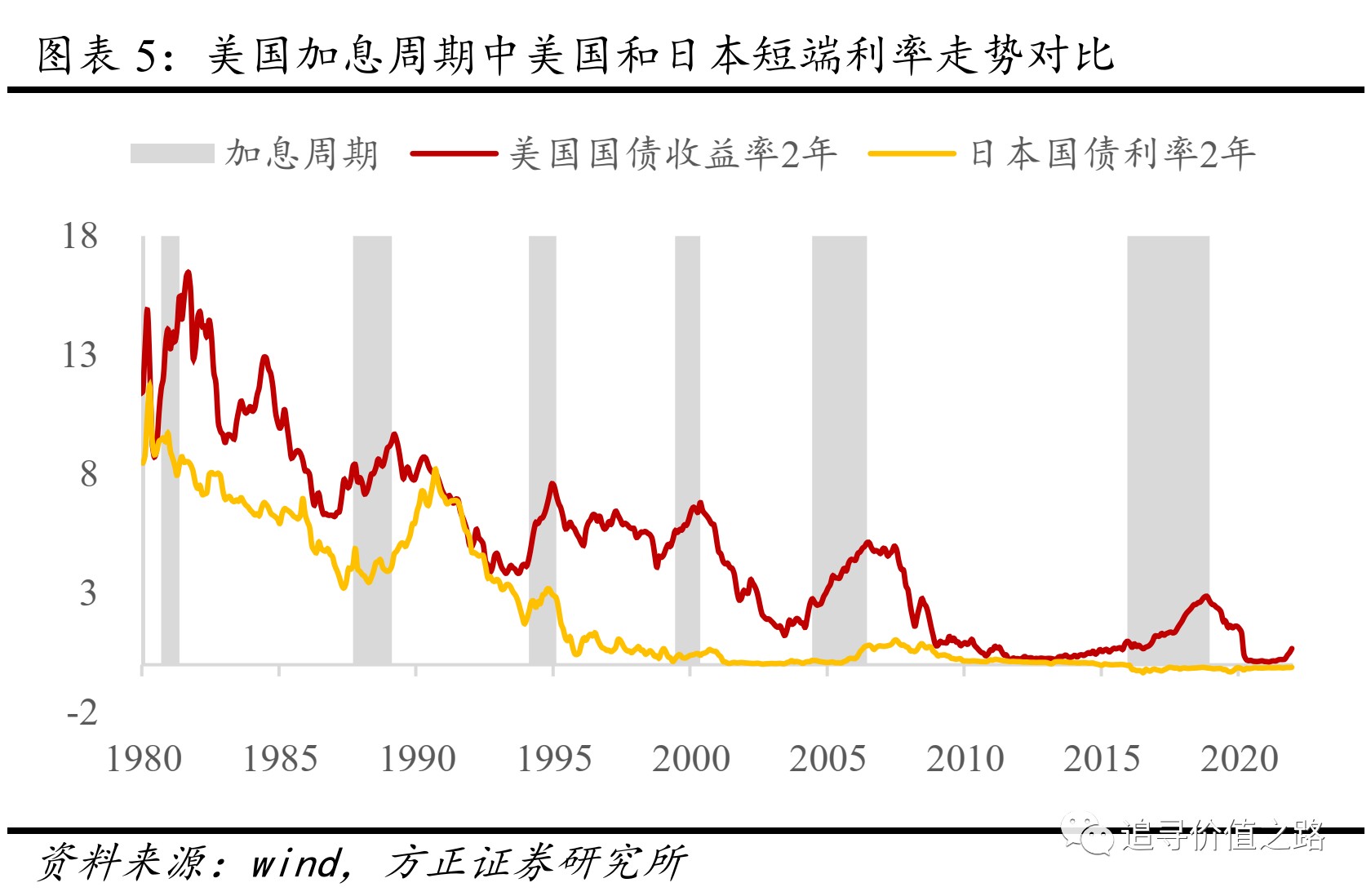 图表5、图表6、图表7分别报告了美国与日本、美国与德国、美国与英国的短期国债利率的走势,其中,美联储的加息周期用灰色阴影进行了标注。从数据经验结果来看,美国与日本、德国、英国等发达国家利率走势并不是完全同步,背离也时常发生。