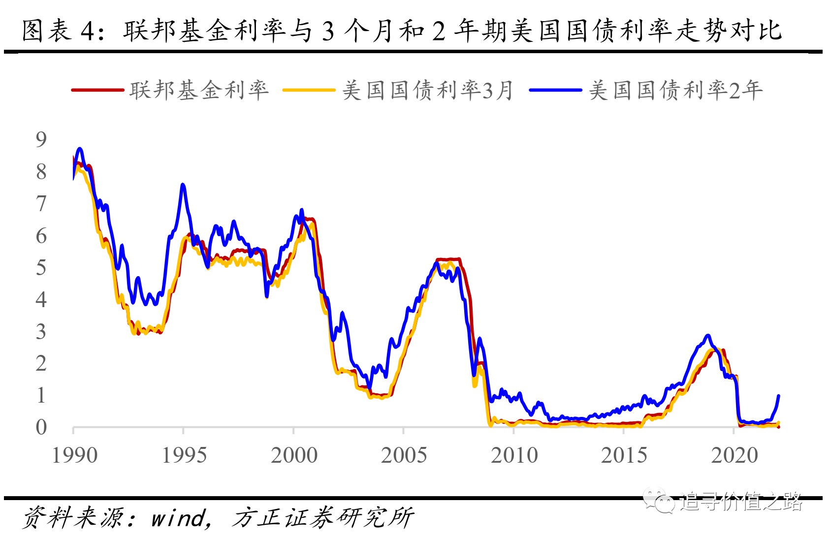 2年期国债利率长期走势与3个月国债利率基本同步,但是波动更大一些,而且从高点低点的拐点来看,2年期国债利率拐点变化更加领先于3个月国债利率和联邦基金利率,能够更好的反映出市场加息或者降息预期的变化。例如,在几次加息正式开始之前,我们都可以发现美国2年期国债利率已经明显起来,反映出市场对后续美联储加息的预期变化。