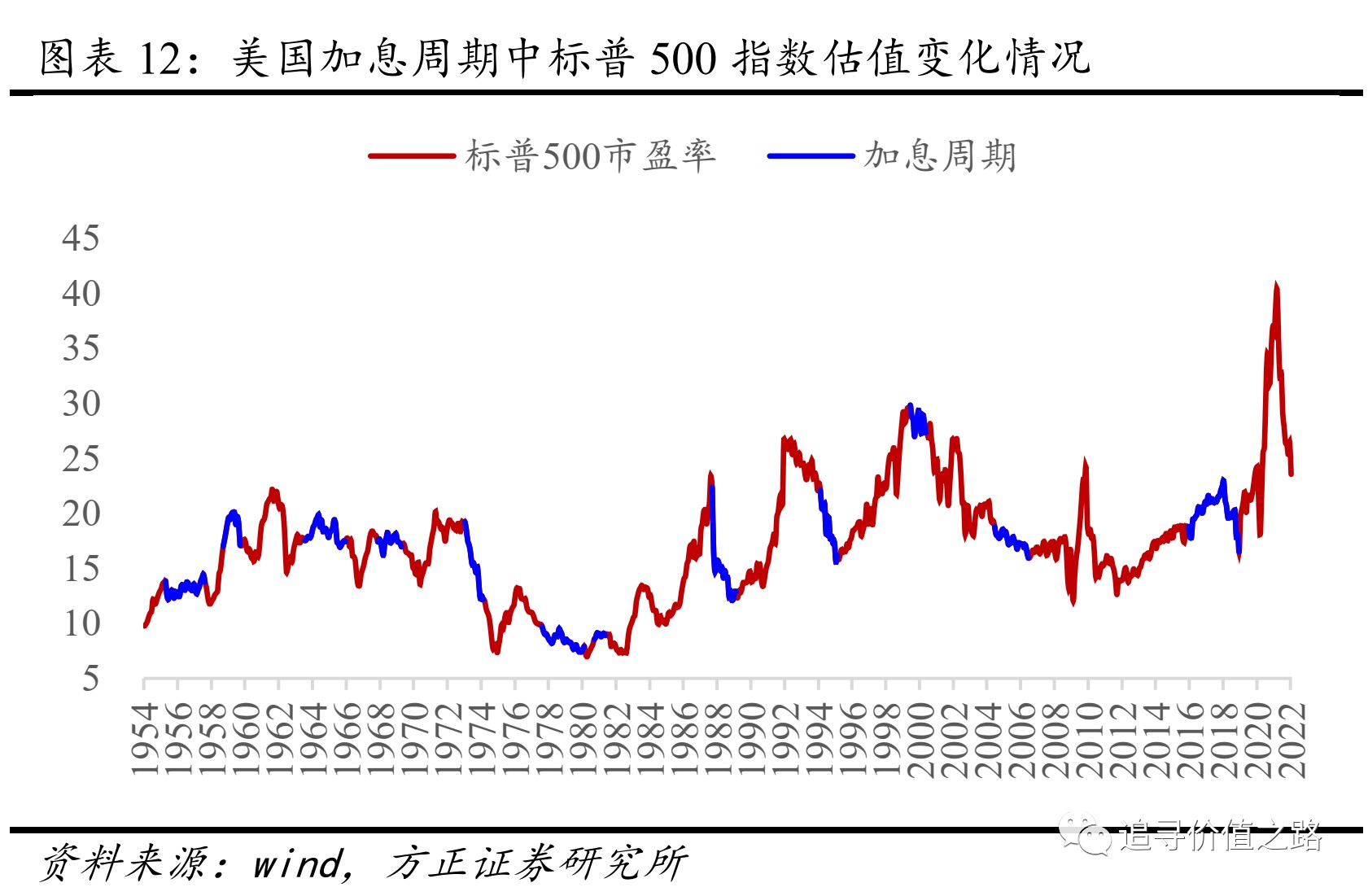 从美股的历史经验来看,上述命题是基本成立的。图表12报告了从1954年到2022年1月美国标普500指数的市盈率变化情况,并用蓝色标出了美联储加息时段。