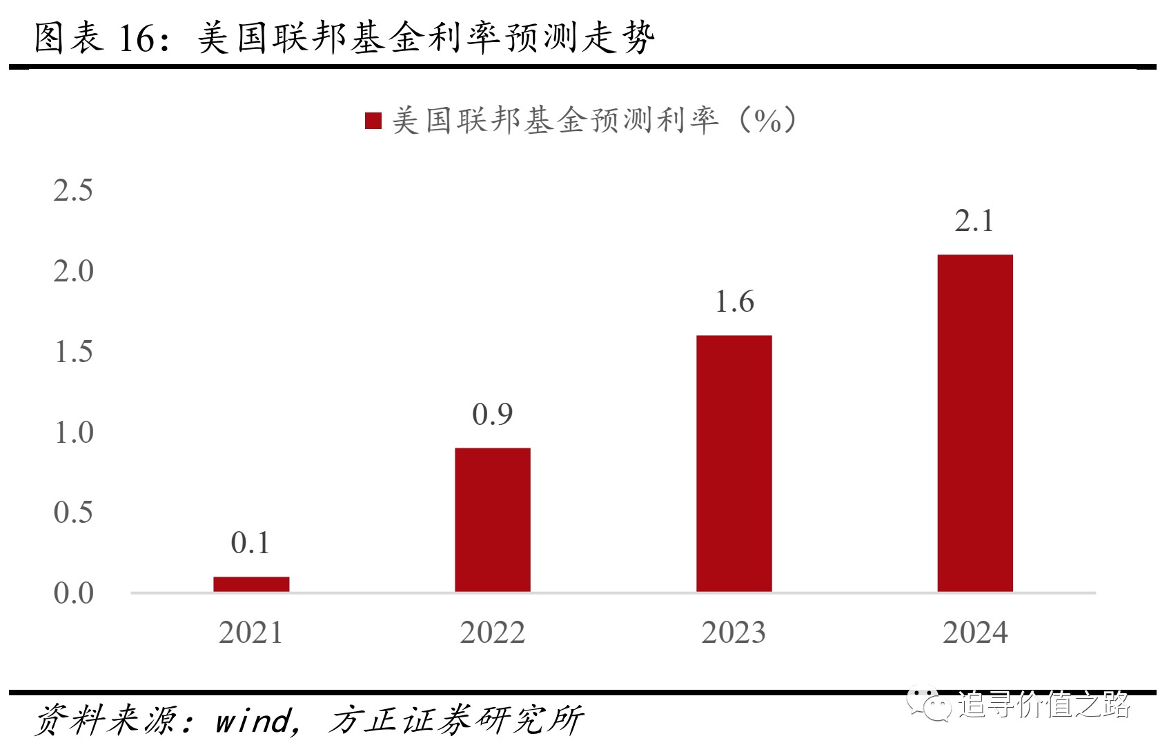 (1)目前市场主流预期判断2022年美联储加息4次左右,联邦基金利率可能达到1.0%左右;后续到2024年,联邦基金利率可能上升到2.1%到2.5%。按此市场预期以及过去三十年里联邦基金利率与美国十年期国债利率的走势关系,预计本轮加息周期中,美国十年期国债利率的高点位置可能也就在2.5%左右(一般加息周期中十年期国债利率高点与联邦基金利率高点大致相当,但高点出现的时间会更早,参见图表17)。