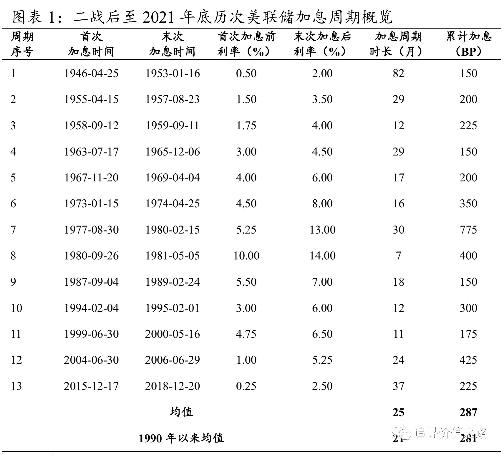 按照贴现利率和联邦基金目标利率的变动,我们统计了二战后到2021年底,美联储前后共有13次加息周期(具体参见图表1)。