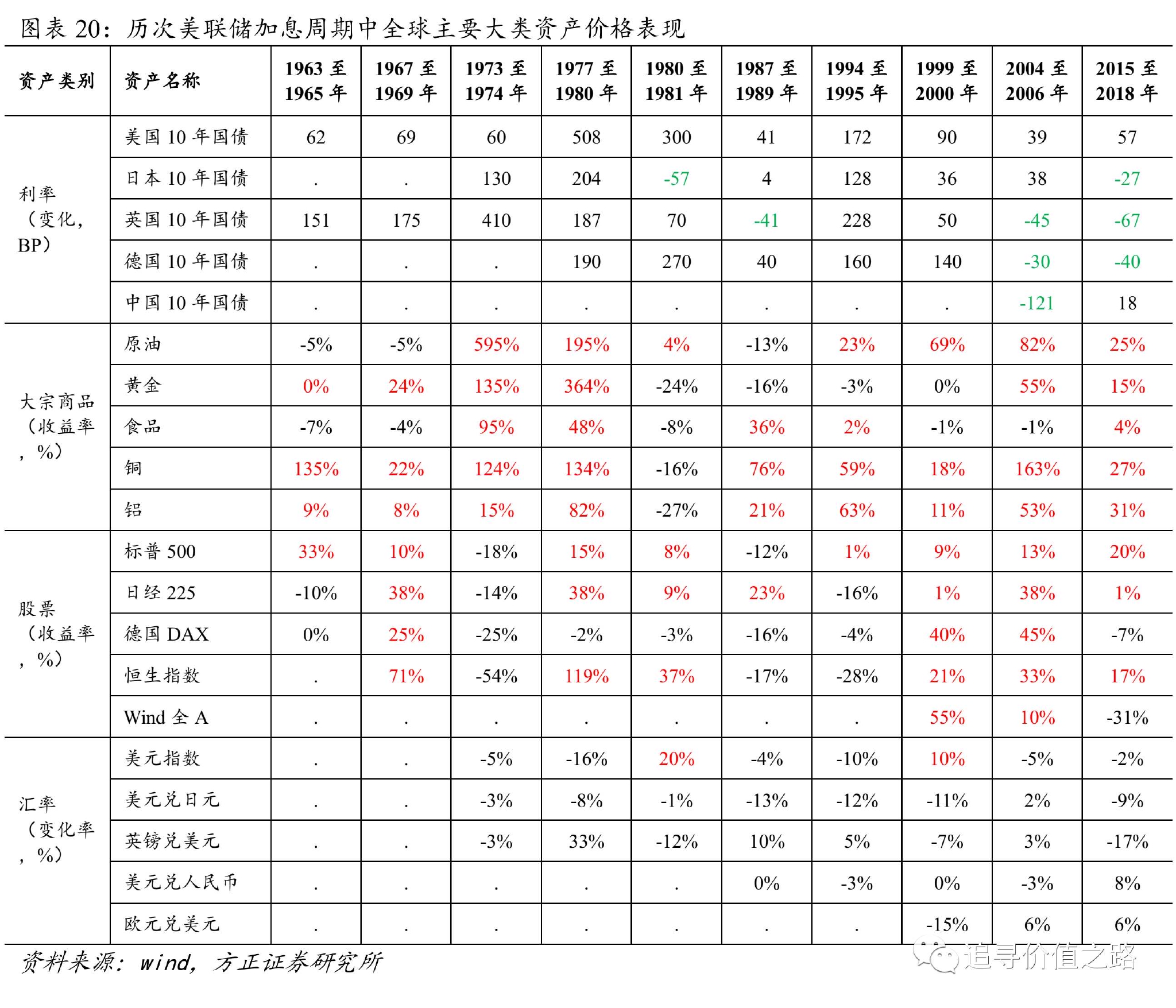 (4)历次加息周期中全球大类资产表现:利率,2000年前各国长端利率普遍上行,2000年后很多国家出现了美联储加息周期中长端利率下行。大宗商品,包括原油、黄金、工业金属等在内多数情况下都是上涨的。股票,上涨概率大于下跌概率,2000年以后更明显。汇率,加息周期中美元指数下行居多。
