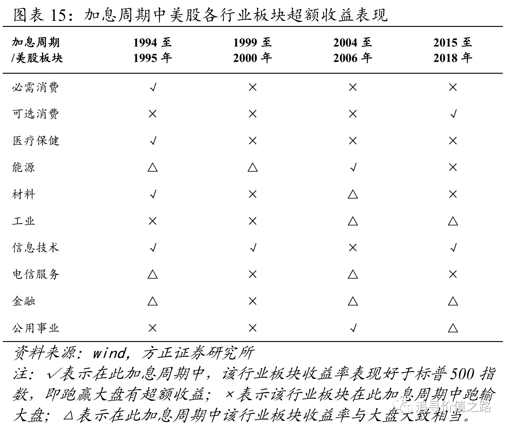 从图表15的结果来看,我们认为最重要的结论是,加息周期本身并没有构成基本面改变的逻辑。在加息周期中,1)金融板块并没有明显的超额收益出现;2)每轮加息周期领涨板块情况各不相同,没有一个行业板块在每轮加息周期中都有超额收益;3)更从长的时间视角来看,每轮加息周期中的领涨(领跌)板块,都是其自身产业逻辑的延续,比如90年代中期以前消费医药领涨、2004年到2006年周期板块领涨、2010年以后科技股领涨,加息周期并没有改变既有的行情特征。