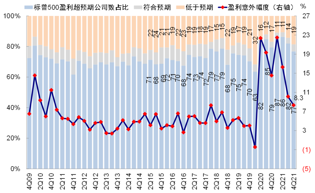 整体来看,当前美股四季度业绩已经过半(披露55%),超预期公司依然占到大多数为77%,不及预期比例为19%,整体盈利同比增长预计为29%(vs. 四季度为39.9%)。短期来看,盈利的压力主要来自成本项的增加(如原材料、工资等)。