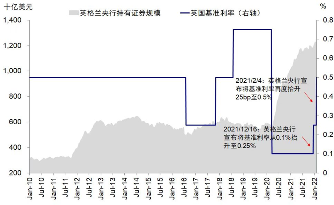 假期期间,全球主要央行货币政策收紧方向进一步明确,紧缩预期强化。如市场广泛预期,英国央行在周四的货币政策会议上决定进一步将基准利率从0.25%进一步上调至0.5%,也是去年12月以来的第二次加息。同时,英国央行决定停止对所持有的国债和公司债的到期再投资,即开启所谓“缩表”。