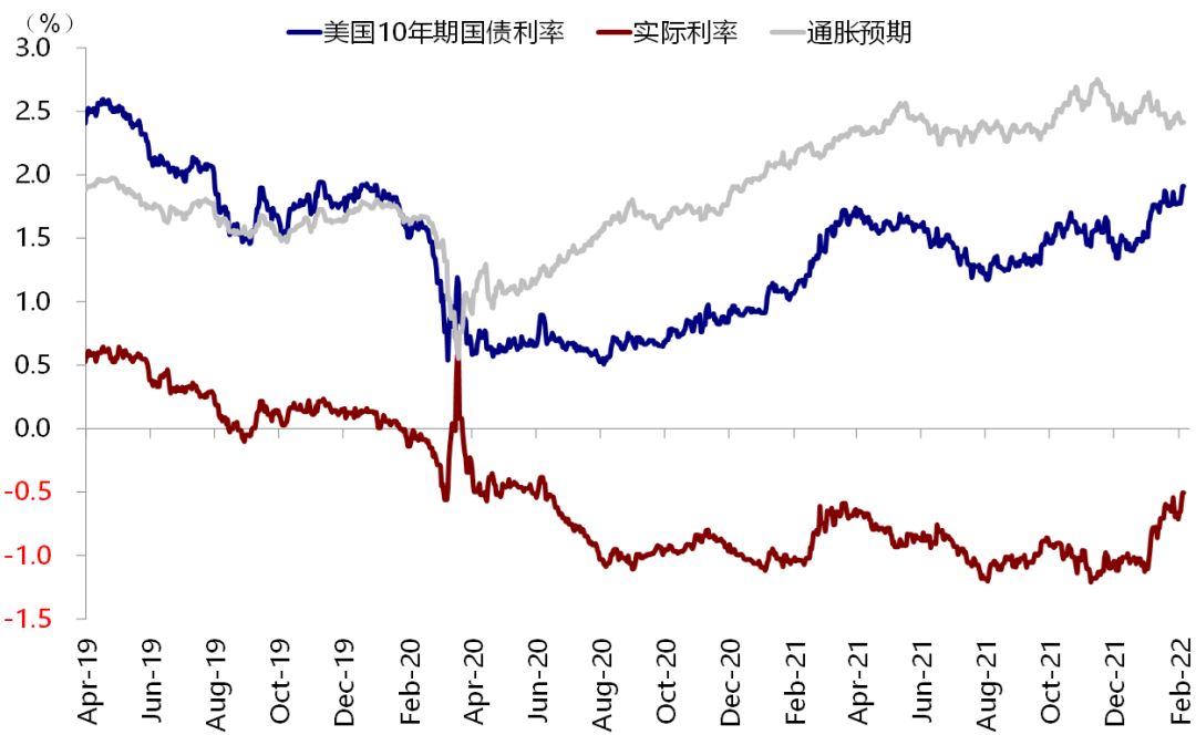 其他资产方面,布伦特油价继续走高超过93美元/桶,为2014年以来新高。10年美债利率在1月非农数据大超预期的推动下,站上1.9%,为2019年底以来新高,实际利率依然是最主要贡献(抬升15bp至-0.51%),通胀预期反而回落。