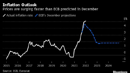 欧洲央行上周做出了鹰派立场,总裁克里斯蒂娜·拉加德面临自欧元诞生以来最快的通胀,现在不再排除今年加息。政策制定者私下认为,正式指导方针的转变最快会在下个月实现,届时他们将获得新的经济预测并重新评估他们的债券购买。紧缩政策将使总部位于法兰克福的公司与全球同行保持一致。