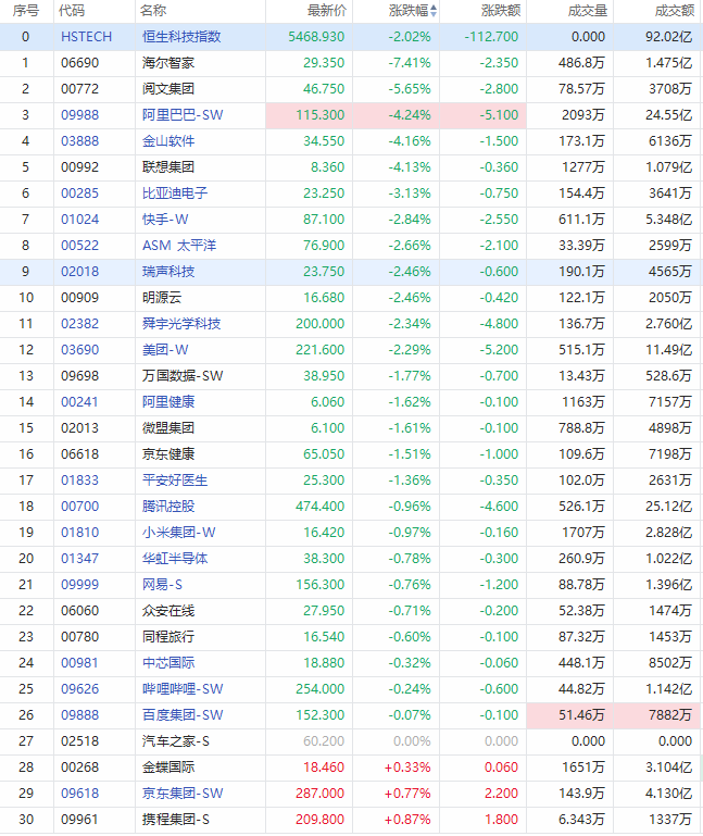 海尔智家跌7.41%,领跌成分股。阿里巴巴跌4.24%;B站跌3.81%,现报115.3港元每股;比亚迪电子跌超3%;快手、ASM太平洋、美团跌超2%;腾讯控股、小米集团、网易跌近1%。