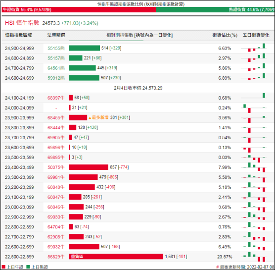 街货分布方面,至上周五,恒指牛证街货重货区在收回价22300点至22700点之间,累计相当约3,897张期指合约;恒指熊证街货重货区在收回价24600点至25100点之间,累计相当约2,936张期指合约。