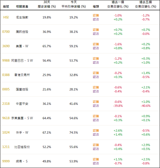 上周五恒指相关权证的平均引伸波幅约19.2%,按日略有调降。个股方面,美团、阿里巴巴、港交所、汇丰、平安及比迪等相关认购证的引申波幅按日有所调降;相反,腾讯、快手、网易等相关认购证的引申波幅按日有所调升。