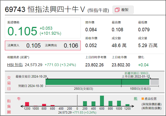 1、强势轮证:恒指法兴四十牛(69743.HK),上周五上涨101.92%;