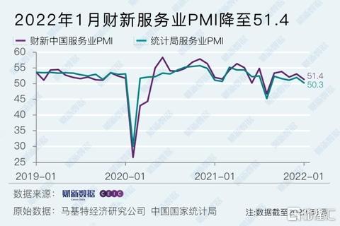 这一走势与国家统计局一致。统计局公布的2022年1月制造业PMI录得50.1,下降0.2个百分点,服务业商务活动指数下降1.7个百分点至50.3,带动综合PMI下降1.2个百分点至51.0。
