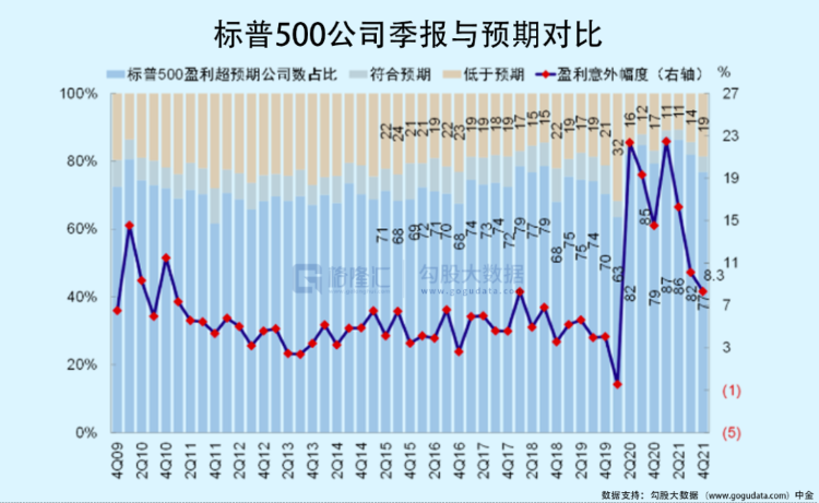 目前美股四季度业绩披露已经过半(55%),超预期的公司依然占到大多数(77%),不及预期比例为19%,整体盈利同比增长预计为29%,这将对指数形成有力支撑——过去十来年美股的长牛主要由业绩驱动(下图红线部分为估值,其实涨幅不大)。