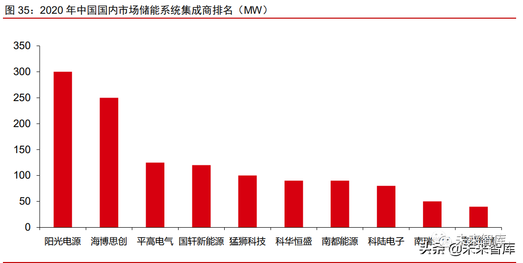 2020 年,中国新增投运的电化学储能项目中,功率规模排名前十的储能系统集成商, 依次为:阳光电源、海博思创、平高电气、国轩新能源、猛狮科技、科华恒盛、南都电源、 科陆电子、南瑞继保和库博能源。(报告来源:未来智库)