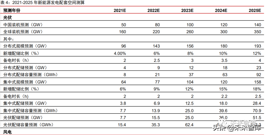 根据我们对 2021-2025 年全球光伏(分布式、集中式)、风电的新增装机规模预测, 在相应配储功率比例和储能渗透率假设下,我们预计 2021-2025 年,光伏发电装机的配 套 储 能 需 求 为 7.7/15.5/25.0/36.0/51.5GW , 相 应 备 电 时 长 假 设 下 的 容 量 预 测 为15.4/35.3/62.4/102.6/163.6GWh;相应风电装机预测下,我们预计 2021-2025 年风电发 电带来的配套储能需求为 1.7/3.6/6.1/9.2/13.0GW,相应备电时长假设下的容量预测为 3.5/7.3/12.2/20.2/32.5GWh。