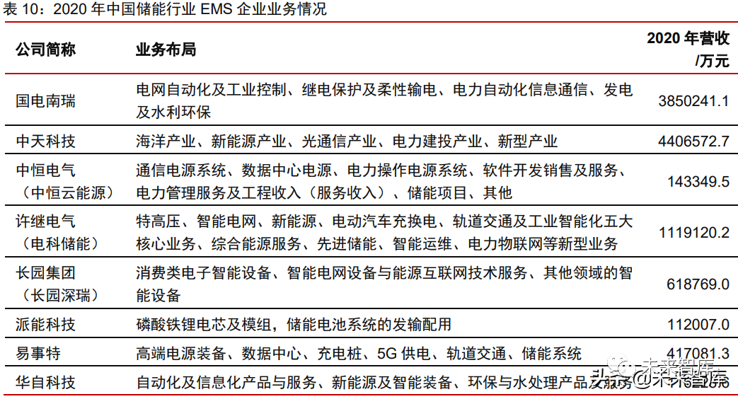 EMS 是储能系统决策的“大脑”,实现数据采集分析、网络监控、能量调度等功能, 从而完成对分布式电源、储能系统、光伏系统、负荷系统等的智能化管理,实现资源与需 求的匹配。EMS 相对其他储能系统部件市场规模较小,目前行业尚未形成优势较大的龙头 企业,从业者以国网系等电力装备提供商为主,例如许继电气。