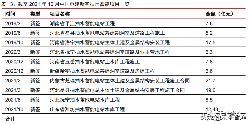 作为行业龙头企业,中国电建在抽水蓄能电站建设领域深耕多年,具有丰富的电站建 设经验,近年来获得多个项目的订单。根据公司公告披露,2019 年至今公司累计新签 10 个抽水蓄能项目,合计金额 114.23 亿元。