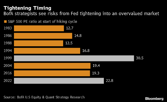 Savita Subramanian牵头的策略师团队在一份报告中写道,虽然美国股市在之前几次加息期间都取得了正回报,但这次的主要风险是美联储“收紧政策正逢市场处于高估期间”。