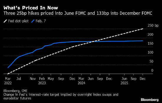在周五公布的数据显示1月非农就业人数意外激增后,市场猜测美联储可能在3月进行2000年以来最大规模升息,一次提高利率50个基点。周五晚间掉期市场一度认为加息50基点的概率接近50%,后来回落至32%左右。