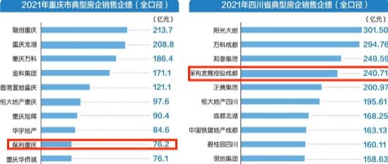 据公开数据显示,融创与龙湖盘踞2021年重庆房企销售排行榜的前两位,四川地区则由阳光大地和万科领衔;徐鲁分管的保利川渝地区,虽然仅以76.2亿元的业绩位列重庆前十,但是四川市场似乎仍有很大的开发潜力。