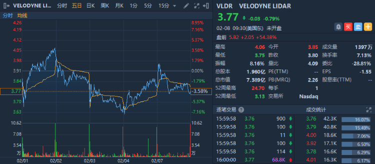 华盛资讯2月8日消息,今日美股盘前,Velodyne一度涨超59%,截至发稿,该股涨超54%。此前,亚马逊宣布与Velodyne达成协议,包括购买该公司多达3960万股股票的认股权证。