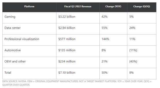 英伟达2022财年Q3数据表现:总营收为71亿美元(同比增长50%),净利润为24.64亿美元(同比增长84%),经调整后的每股收益为1.17美元(市场预期1.11美元)。
