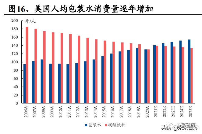 包装水符合美国的健康化诉求,不断瓜分碳酸饮料市场。2020 年,美国包装 水消费量再达历史新高,碳酸饮料连续第 6 年缩减。根据 Euromonitor,2020 年美国包装水及碳酸饮料消费量分别为 431 亿升及 433 亿升,二者体量趋近, 差距进一步缩小。同时,美国包装水人均消费量逐年提升。根据 Euromonitor,2020 年,美国人均包装水及碳酸饮料消费量分为 130.2 升/人及 130.6 升/人, 包装水及碳酸饮料的人均消费量接近。根据 Euromonitor 预计,未来包装水 将超越碳酸饮料成为美国消费量第一的软饮品类。