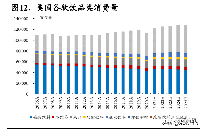 具有激活换新、提神醒脑的功能性饮料正占据时尚饮品的潮流风口。根据 Euromonitor 预计,2025 年我国功能性饮料规模将达至 658 亿元,2021-2025 年 CAGR 约为 4.6%,是除包装水外增长最快的赛道。此外,即饮茶和咖啡仍将保持 较快成长势头,运动饮料也将稳步发展。根据 Euromonitor 预计,2025 年我国即 饮茶、咖啡及运动饮料规模分别将达至 1372 亿元、124 亿元及 146 亿元,2021-2025 年 CAGR 分别为 2.8%、3.7%及 2.9%。(报告来源:未来智库)