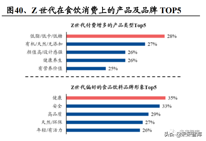 Z 世代对“三低1 +有机”饮品颇有好感,健康风仍将是主流。Z 世代在食饮消费上,最看重“三低”与“有机”, 以及健康安全的品牌。我们认为,Z 世代对“三低”的偏好产品将促使无糖低糖 类饮品增长迅猛。无糖茶饮、0 糖 0 卡饮料等健康化产品将具备高增长潜质。