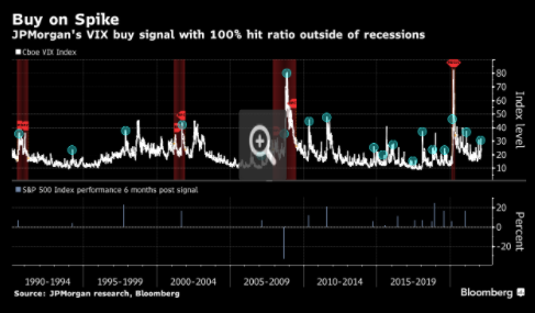 Mislav Matejka牵头的策略师团队指出,当Cboe波动率指数(VIX)上涨并比其1个月移动均线超出50%以上时,就会触发买入信号。在过去的三十年里,除了经济衰退期间,该指标的预测准确率达到惊人的100%。