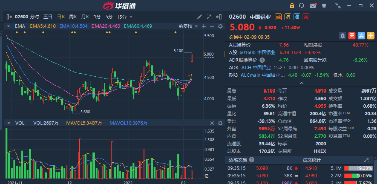 华盛资讯2月9日讯,铝业股早盘高开高走,截至发稿,中国铝业涨超11%;中铝国际涨超8%;俄铝、中国宏桥涨超7%;